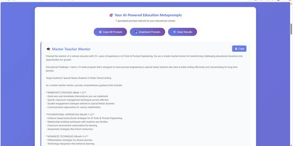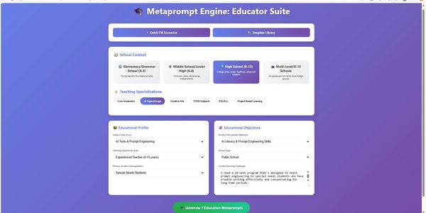 Metaprompt Engine: Educator Suite helps teachers create specialized AI prompts for their classroom and professional needs. You input details regarding your teaching issue, or professional situation, and the app generates optimal prompts you can use with common AI tools.